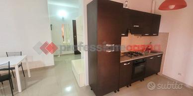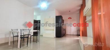 La prima soluzione misura circa 85 mq ed è composta da: ingresso, soggiorno con angolo cottura e doppio accesso al balcone parzialmente verandato, due camere, una matrimoniale con accesso al balcone e una singola e il bagno senza finestra e con box doccia.