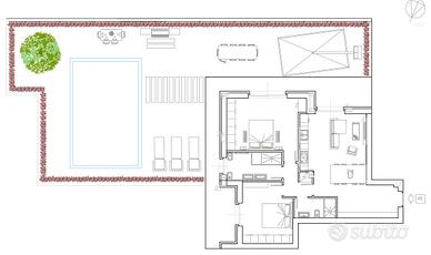 L'abitazione si compone di ampia zona giorno open space con cucina a vista, 2 camere da letto luminose e ben distribuite, doppi servizi finestrati, lavanderia e giardino privato.
