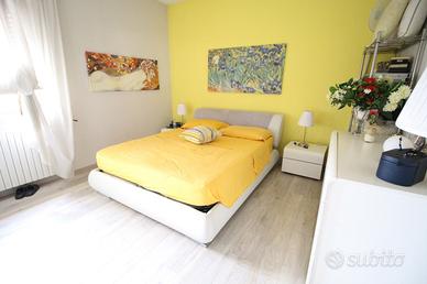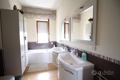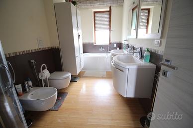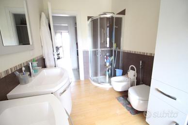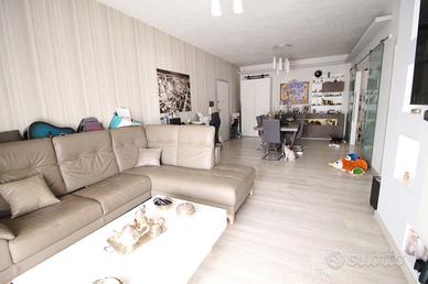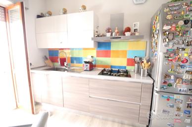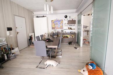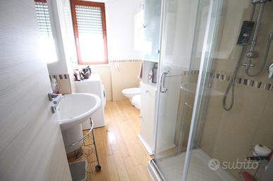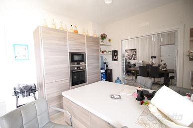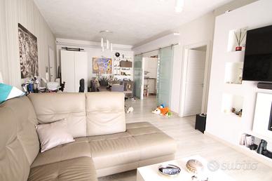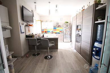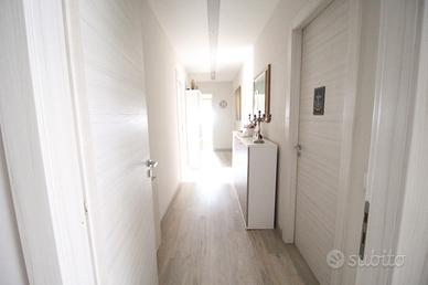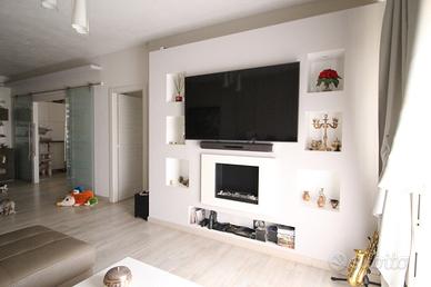 L'immobile è composto da un ampio soggiorno-salotto doppio con caminetto a bio-etanolo, cucina abitabile completa di cucina componibile con tutti gli accessori con penisola realizzata su misura marca LUBE. Si compone di: disimpegno, due camere da letto matrimoniali, una cameretta/studio, due bagni, garage doppio di proprietà.