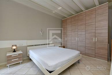 Dalla zona giorno si accede alla zona notte dove troviamo il disimpegno, un bagno finestrato con doccia, grande camera singola con affaccio sul piccolo giardino posteriore esterno e una camera matrimoniale anch'essa con vista lago dalla porta finestra.