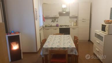 Due bagni con doccia e grande sala giorno con cucina, due balconi e stufa a pellet .