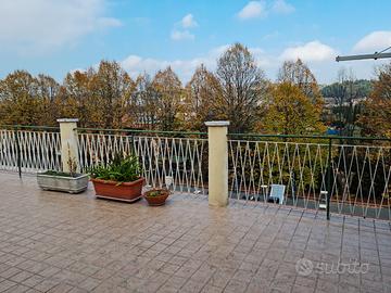 Appartamento con terrazzo mq 150 circa, secondo ed ultimo piano esposto su 4 lati. Ampio soggiorno con camino, tre camere da letto, due matrimoniali ed una singola, cucina abitabile con retrocucina ed ulteriore camino, due bagni entrambi finestrati, uno con vasca l'altro con doccia, due verande, grande terrazzo di circa 80 mq e due balconi, soffitta sovrastante l'appartamento ad uso esclusivo.