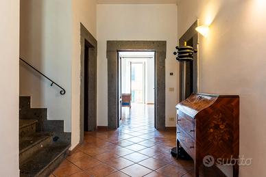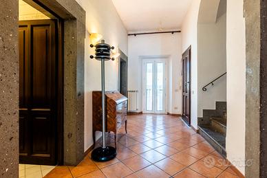 Il piano principale della casa è composto da grande ingresso, ampio salone con camino e affaccio sul balcone con esposizione sulla via principale, cucina abitabile con balcone di servizio verandato, bagno con doccia, comoda camera da letto matrimoniale, altro grande ambiente con armadi. La comoda e bellissima scala lineare interna, interamente realizzata in marmo peperino grigio con corrimano in ferro battuto, ci conduce al piano superiore dove troviamo un disimpegno con uscita sul balconcino ed un living/zona relax. Pochi ulteriori gradini portano alla zona notte che ospita due camere da letto e una grande mansarda caratterizzata dal tetto con travi in legno a vista con predisposizione per la realizzazione di un servizio. Questi ultimi ambienti si presentano parzialmente allo stato grezzo con pavimentazioni da ultimare. Gli ultimi gradini della casa conducono alla terrazza privata con spettacolare vista panoramica a 360 gradi. Il marmo piperino grigio caratterizza gli ambienti incorniciando anche le porte della casa.