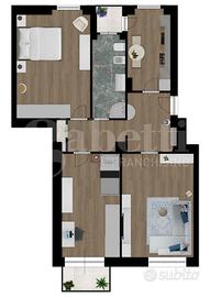 L'immobile è composto da un ampio ingresso, soggiorno, cucina abitabile con balcone, disimpegno notte, bagno finestrato e due camere da letto matrimoniali di cui una con grande balcone.