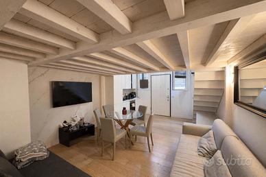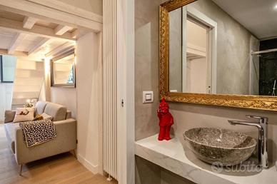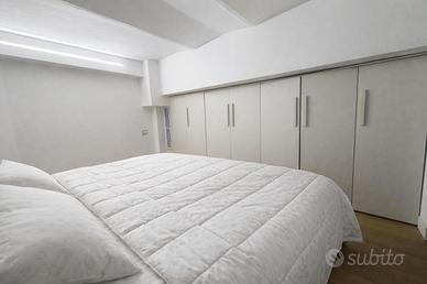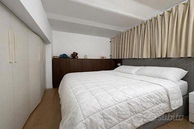 Il loft è dotato di un bagno elegante, completo di box doccia e rifinito con piastrelle effetto marmo, che conferiscono un tocco di raffinatezza. Un soppalco, accessibile tramite una comoda scala, funge da camera matrimoniale, dotata di armadiatura su misura che ottimizza ogni centimetro disponibile, garantendo funzionalità e stile.