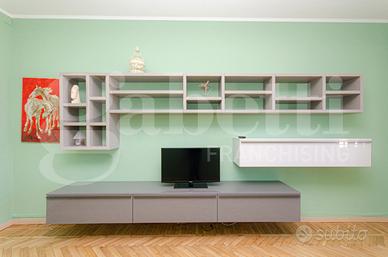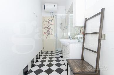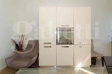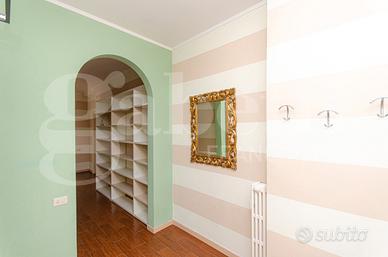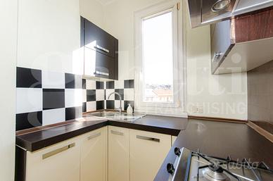 L'immobile risulta molto luminoso e silenzioso grazie alla doppia esposizione est-ovest e al piano alto, si presenta in ottime condizioni con porta blindata, aria condizionata, infissi in doppio vetro e viene locato parzialmente arredato con cucina completa di lavastoviglie e lavatrice, un letto matrimoniale e due armadi nelle camere oltre al mobile tv della zona giorno.