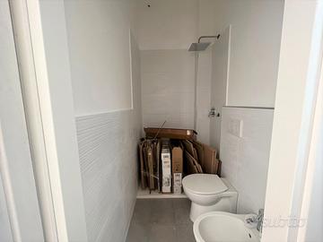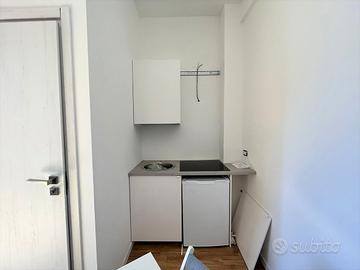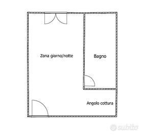 Ingresso su zona giorno notte, con spazio per l'angolo cottura e bagno con box doccia.