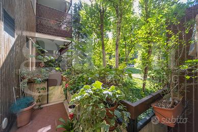L'appartamento si apre su un ampio e luminoso soggiorno con terrazzino, reso ancora più accogliente dalla tranquillità del contesto e dagli affacci verdi. All'ingresso, un comodo ripostiglio in quota offre uno spazio aggiuntivo utile e funzionale, ideale per riporre oggetti. La cucina è abitabile e valorizzata da uno splendido pavimento in gres porcellanato con effetto in ardesia, un dettaglio che dona carattere e stile all'ambiente, con accesso al secondo balcone. La zona notte è composta da una spaziosa camera da letto con cabina armadio e un ulteriore soppalco in quota, oltre a un bagno finestrato, pratico e ben arieggiato.