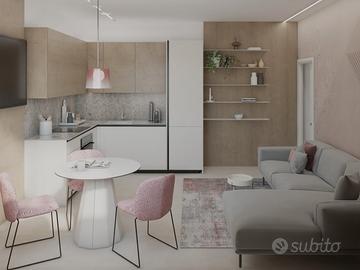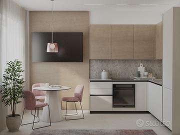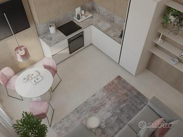 L'appartamento presenta un ingresso accogliente e funzionale, salotto con angolo cottura, camera da letto matrimoniale, bagno e ripostiglio;