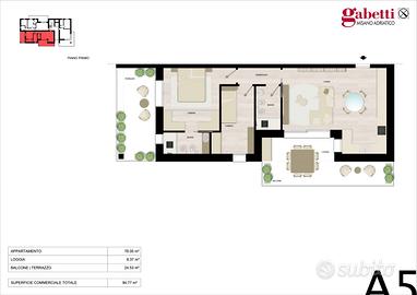 L'appartamento A5, situato al primo piano, è una soluzione dove il design contemporaneo incontra la vivibilità in ogni stagione. La generosa zona giorno si affaccia su un ampio balcone in parte loggiato, un'estensione protetta e soleggiata della casa.