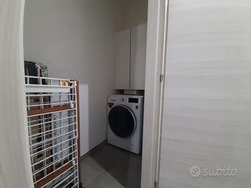 Ripostiglio con lavatrice e una pratica nicchia appendiabiti a scomparsa nel corridoio, pensata per ottimizzare al meglio ogni spazio