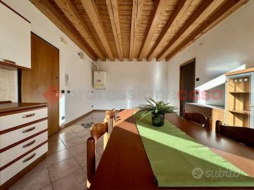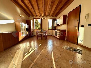 La zona giorno, luminosa e impreziosita da travatura a vista, accoglie chi entra con un senso immediato di "casa". Ogni ambiente è studiato per essere pratico e allo stesso tempo caratteristico, perfetto per chi cerca una soluzione dal gusto ricercato.