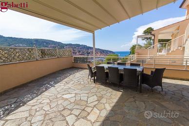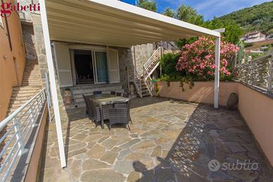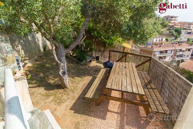 Il soggiorno ha una grande porta-finestra che si affaccia sul terrazzo, coperto da una tettoia, dal quale si ha una bella vista sul paese e sul mare; un passaggio laterale conduce nel piccolo giardino di pertinenza, anche questo con vista mare.