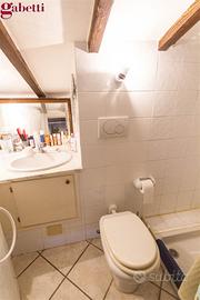 una scala a chiocciola in ferro conduce nel soppalco, dove è stata realizzata, nel sottotetto molto alto, una piccola zona notte con bagno interno dotato di doccia.