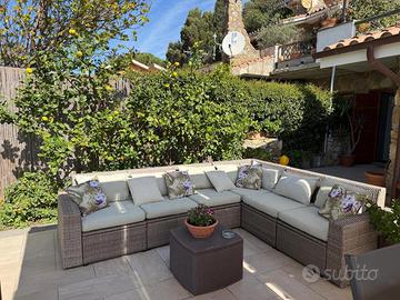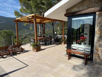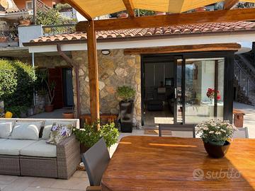 La grande terrazza pavimentata è perfetta per offrire una ampia godibilità degli spazi esterni, arredati con gazebo e salotto da giardino per vivere all'aperto, circondati dal verde e nella confortevole privacy.