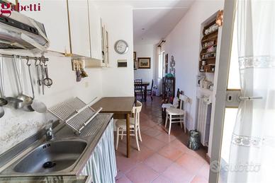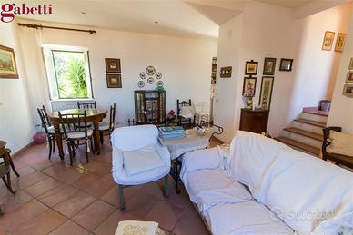 Una breve scala esterna conduce al primo piano, dove si trova l'abitazione principale: soggiorno molto luminoso con finestra vista mare e seconda finestra affacciata sul verde, angolo cottura con porta-finestra sul retro del fabbricato.