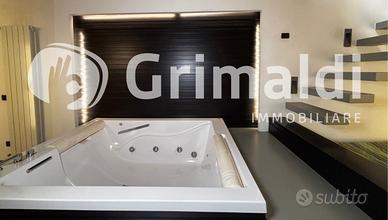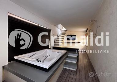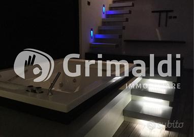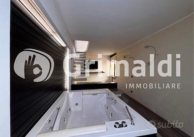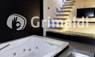 La zona notte ospita una spaziosa camera da letto con una splendida vasca idromassaggio integrata e una scala dal design moderno, con luci LED incassate, che conduce al livello superiore dove si trova una comoda cabina armadio con accesso a un balcone privato.
