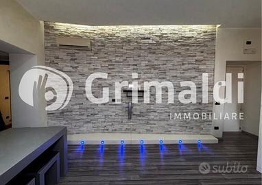 L'ingresso si apre su un accogliente soggiorno con doppia finestra, impreziosito da una parete in pietra bianca a vista e da un raffinato sistema di illuminazione a LED che dona calore e modernità all'ambiente.