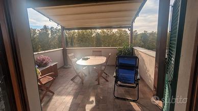 Accedendo da ultima rampa da scale e balconcino privati si entra in caratteristico soggiorno con caminetto e tramite grande porta finestra si accede in ampio terrazzo abitabile e panoramico. Sempre la zona giorno è composta da un angolo cottura / pranzo in muratura ben nascosto dalla vista all'ingresso e da un bagno di servizio finestrato e dotato di attacco per lavatrice. La zona notte si compone di una camera singola, due matrimoniali e il bagno principale anch'esso finestrato.