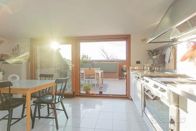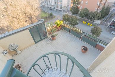 5° ed ultimo piano con ingresso, ampio salone con camino e due terrazzi di 14 mq e 9 mq, cucina abitabile con terrazzo di 20 mq, servizio e ripostiglio;