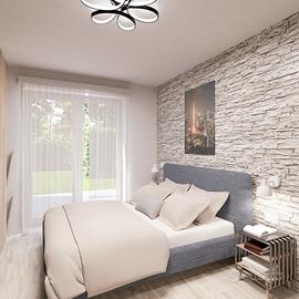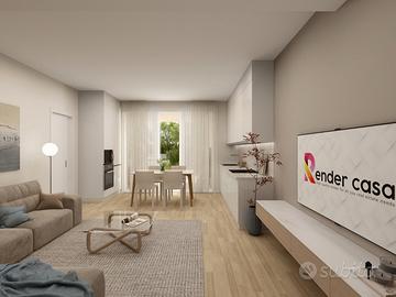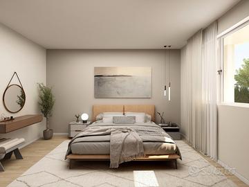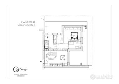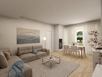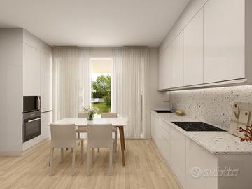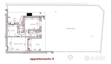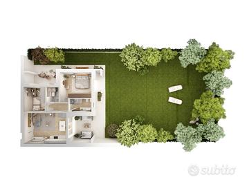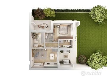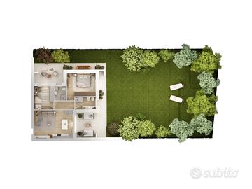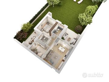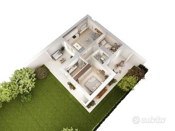 APPARTAMENTO 4: Tre locali, posto al piano terra con giardino angolare di mq. 240 - L'appartamento è composto da ingresso nella zona living servita da porticato di 20 mq. affacciato sul giardino, disimpegno, due camere e bagno.