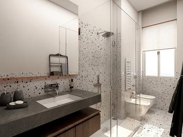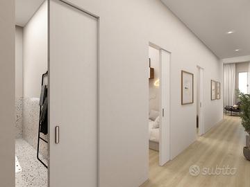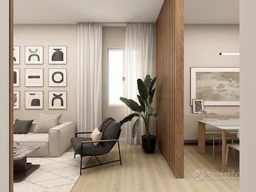 L'abitazione si distingue per finiture moderne e di alta qualità: gli ambienti sono impreziositi da un elegante parquet in rovere naturale con posa a spiga italiana, presente in tutta la casa ad eccezione dei bagni, dove è stato scelto un raffinato gres porcellanato. I servizi sono curati nei dettagli, con sanitari a filo muro e piatto doccia slim dal design contemporaneo.