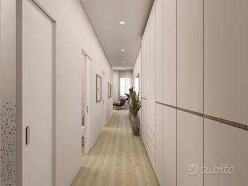 La zona notte comprende una MASTER ROOM completa di cabina armadi e bagno privato, una camera singola e un bagno finestrato disimpegnato.