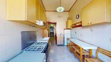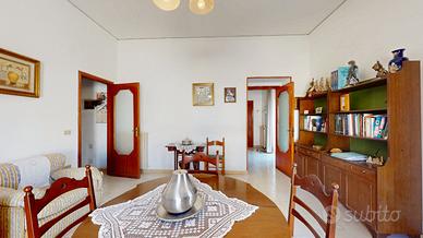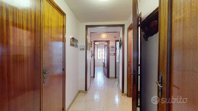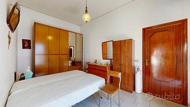 La casa si compone di un ampio disimpegno, un salone, caratterizzato da due balconi posti in posizione angolare che offrono una splendida luce naturale, due camere, anch'esse con affaccio esterno e balcone. Completano la proprietà una cucina abitabile, due bagni e un pratico ripostiglio.