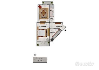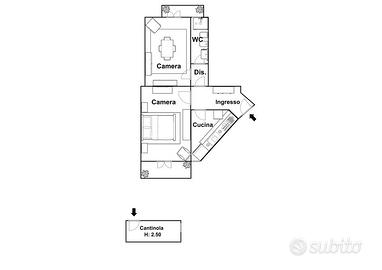 L'appartamento, in buono stato, è composto da ingresso, due camere, bagno e cucinotto. La doppia esposizione garantisce luminosità e ariosità costanti, mentre la cantinola di circa 5 mq offre praticità aggiuntiva.