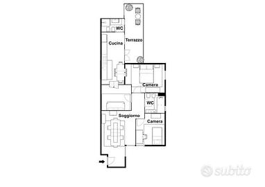 L'immobile si presenta con una distribuzione interna funzionale: l'ingresso conduce al soggiorno, la cucina è separata e abitabile che conduce al terrazzo a livello, la zona notte è composta da due camere da letto e due bagni. Gli ambienti risultano ben organizzati e consentono diverse possibilità di personalizzazione.