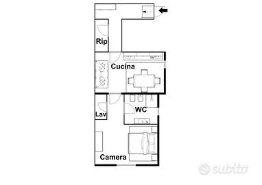 L'appartamento è composto da: camera, soggiorno con angolo cottura, ingresso, bagno, lavanderia e ripostiglio, con una distribuzione funzionale degli spazi.