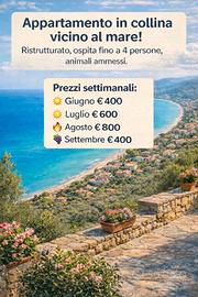 Appartamento recentemente ristrutturato a Ogliastro Cilento, situato in collina a 10 minuti dal mare. L'appartamento è composto da un porticato esterno ideale per rilassarsi all'aperto, soggiorno con cucina attrezzata, camera da letto matrimoniale e divano letto matrimoniale in soggiorno. Sono presenti due balconcini, uno nella camera da letto e uno nel soggiorno. Il bagno è completo. Aria condizionata sia nel soggiorno che nella camera da letto , TV e Wifi, lavatoio all' esterno( nel porticato )con lavatrice , due posti auto privati. L'appartamento è completamente nuovo, dagli arredi agli impianti. Nel paese sono presenti tutti i servizi essenziali raggiungibili a piedi, come supermercato, bar, farmacia e altro. L'appartamento è collocato a livello strada e molto luminoso. Per informazioni: Francesco - 331 540 1451 Francesco è mio figlio. Contattate esclusivamente lui.
