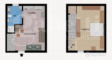 Disposta su due livelli con zona giorno, angolo cottura e bagno finestrato al piano terra, ampia e comoda camera da letto cono annesso studio e piccolo servizio al piano primo collegati da scala interna.