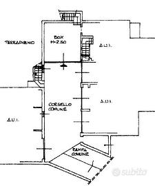 La scala interna conduce al piano seminterrato di oltre 31 mq, ben rifinito ed utilizzato come locale hobby dal quale si accede direttamente con una porta di sicurezza al box doppio in larghezza, di 25 mq, con due basculanti.