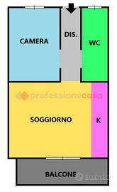 L'abitazione dispone di un disimpegno d'ingresso che compagna al soggiorno con cucina a vista ed accesso al balcone, troviamo poi la camera matrimoniale ed il bagno.