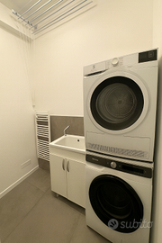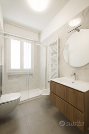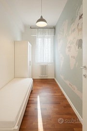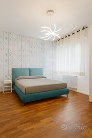 L'ingresso si apre su un'ampia zona giorno open space con cucina a vista e doppia porta finestra, che garantisce un'eccellente luminosità durante tutta la giornata. La zona notte è composta da due camere da letto, una lavanderia separata con predisposizione per lavatrice e asciugatrice, e un bagno finestrato dotato di un'ampia doccia. L'appartamento è inoltre dotato di infissi nuovi con vetri tripli ad alto isolamento, impianto elettrico e idraulico completamente rifatti, riscaldamento centralizzato con caldaia sostituita nel 2024, e impianto di climatizzazione. Tutti gli ambienti interni sono valorizzati da un parquet di alta qualità, elegante e resistente, scelto con particolare attenzione al design e al comfort abitativo.