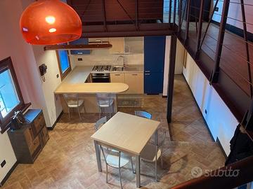 Aprendo il portoncino blindato ci troviamo nel'open space soggiorno/cucina, alzando la testa nel soppalco si trova la camera illuminata da lucernario. Nella zona pian terreno c'è un piccolo disimpegno e il bagno con ampia doccia. All'esterno abbiamo l'ampio marciapiede e due posti auto di proprietà. Completamente arredato, tutti impianti autonomi, il riscaldamento a pavimento. Libero da subito, ideale per una coppia giovane essendo veramente coccolo. Il canone è comprensivo di spese condominiali non di utenze.