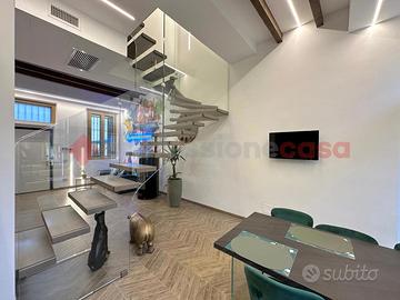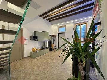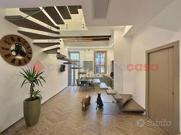 Al piano terra l'ingresso si apre su un ampio e luminoso salone con cucina a vista, impreziosito da una scala di design in cristallo e legno che diventa vero elemento architettonico della casa.