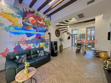 Le grandi vetrate garantiscono un'eccellente luminosità e permettono l'accesso diretto al giardino retrostante, ideale per momenti di relax e convivialità.