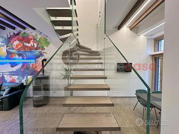 Al piano terra l'ingresso si apre su un ampio e luminoso salone con cucina a vista, impreziosito da una scala di design in cristallo e legno che diventa vero elemento architettonico della casa.