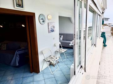 Proponiamo in vendita un bilocale ristrutturato sul mare e composto da: ingresso, cucina ad angolo cottura, soggiorno con accesso al balcone di oltre 7 metri vista mare per prendere il sole e godere il mare in totale privacy con tende da sole (nuove da due anni) che possono scendere sull'intera balconata, una camera da letto, due bagni finestrati e un comodo soppalco. Il riscaldamento è autonomo con pompa di calore (caldo/freddo); le spese condominiali ammontano a 700 euro l'anno; la proprietà gode di utilizzo proprio di una scogliera condominiale. L'immobile viene venduto eventualmente arredato. L'alloggio si trova a pochi minuti da Sanremo e a qualche kilometro dalla Costa Azzurra. Nei dintorni troviamo pista ciclabile, stabilimenti balneari e supermercato, a ridosso della splendida città di Ospedaletti. Possibilità di usufruire della spiaggia adiacente. Per maggiori informazioni e per la visita di questa interessante proposta immobiliare si prega contattare il Geometra Domenico Borla al -
