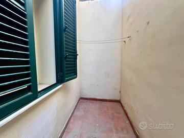 L'immobile ha una superficie di circa 70 mq e si accede direttamente da una persiana in legno che affaccia sulla strada. Una volta entrati, ci accoglie un soggiorno luminoso, perfetto come zona living o salottino. A seguire, troviamo un cucinino con accesso a un piccolo balconcino interno, utile come zona lavanderia o spazio esterno riservato.