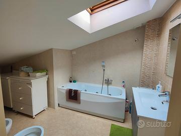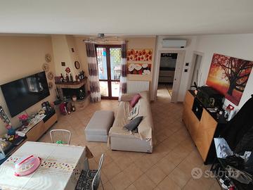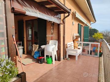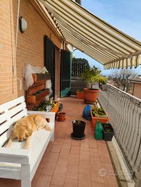 In zona residenziale e tranquilla ma a 300 MT dal paese, ampio parcheggio libero e sottostante PRIVATO più garage, vende bellissimo appartamento panoramico con ottima esposizione sud/ovest/nord; posto al secondo ed ultimo piano con ascensore, più mansarda collegata internamente, per un totale calpestabile di 85 MT + 40 di mansarda abitabile cn balconcino. Esternamente vi è un gazebo con tenda ermetica x inverno dove poter mangiare nel terrazzo che occupa due lati dell'appartamento in una superficie di 30 mq più un balcone che si affaccia dalla facciata principale a cui vi si accede dalla cameretta. Molto luminoso e ottima posizione che si affaccia sulle colline aperte sia sul fronte che nel retro. Riscaldamento autonomo, aria condizionata, secondo bagno in mansarda con vasca idromassaggio nuova, predisposizione x attacchi di una eventuale cucina, molti lucernai e sottotetto. Il piano principale è dotato di un grande salone con camino, doppie porta finestre che affacciano sul meraviglioso terrazzo dove vi è la caldaia a condensazione nuova,una cucina moderna su misura anch'essa cn affaccio sul terrazzo e che verrà lasciata compresa di elettrodomestici, comperata due anni fa; un corridoio che porta alla camera matrimoniale con finestra grande, la cameretta cn porta finestra x accedere al balcone ed un bagno dotato di doccia cn finestra che si apre sul balcone completamente rinnovato due anni fa. Porte nuove, di cui due a scrigno, cucina e camera; zanzariere nuove plissettate ( bloccaggio a scelta) e dulcis in fondo, due tende a bracci una a caduta in cameretta ed l' altra molto grande a bracci estensibili nuove anch'esse. Vendiamo causa avvicinamento lavoro. Se interessati invio altre foto e/o poter visionare senza impegno. Grazie Romina.