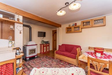L'immobile si presenta come la soluzione ideale per chi desidera un rifugio di montagna intimo e funzionale: la zona giorno con angolo cottura e stufa a legna in maiolica regala un'atmosfera calda e conviviale, mentre la camera matrimoniale e la seconda stanza con letto a castello offrono comodi spazi per famiglia o ospiti. Il bagno finestrato assicura comfort e luminosità.