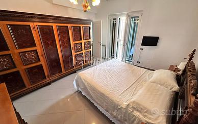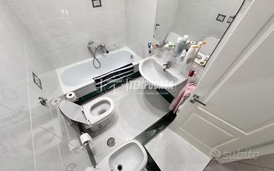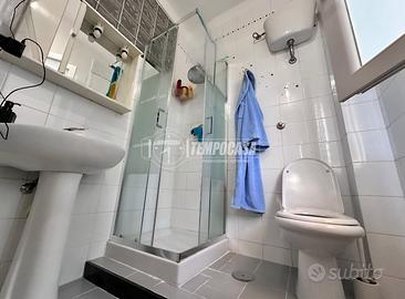 L'appartamento si presenta con un ingresso dotato di porta blindata, un ampio salone luminoso, una cucina abitabile e un disimpegno che distribuisce le due camere da letto, di cui una con armadio a muro e l'altra con ripostiglio soppalcato. I due bagni sono entrambi finemente rifiniti, uno con doccia e l'altro con una comoda vasca. Inoltre, un ulteriore ripostiglio in legno noce è stato utilizzato come cappelliera e guardaroba.