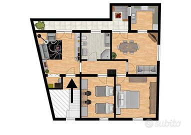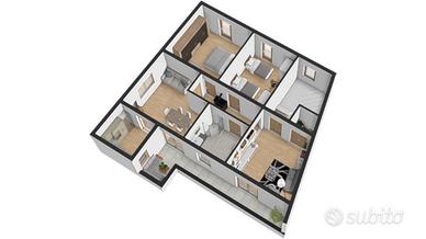 Proseguendo lungo il disimpegno, accediamo ai restanti ambienti dell'appartamento: sulla sinistra troviamo l'ampio bagno dotato di doccia e zona lavanderia, mentre sulla destra troviamo la zona notte, caratterizzata dalla presenza di una camera doppia di circa 12 mq e di una camera matrimoniale di circa 14 mq, entrambe dotate di porta finestra con affaccio alla francese, che garantiscono un ottima luminosità e un facile ricambio d'aria.