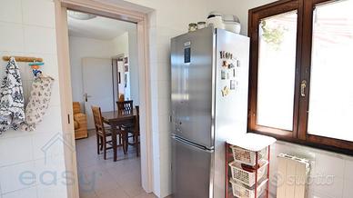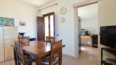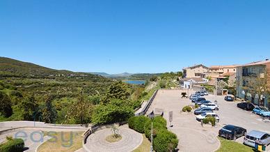 Oltrepassando la zona notte, accediamo alla spaziosa sala da pranzo con cucinotto separato, munita di porta finestra che conduce ad un comodo balcone, ideale per creare una zona relax con dei comodi divanetti o posizionando un tavolino per fare colazione all'aperto in tranquillità e riservatezza; la presenza di un ulteriore finestra, posta di fronte al tavolo, garantisce una doppia esposizione all'ambiente e consente di consumare i pasti giornalieri godendo di uno spettacolare panorama sul lago Is Barrocus e sui monti che lo contornano.