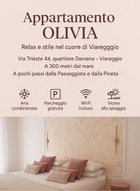 ? Appartamento "OLIVIA" - Relax e stile nel cuore di Viareggio ?? Via Trieste 44, quartiere Darsena - Viareggio? A 300 metri dal mare, a pochi passi dalla famosa Passeggiata e dalla Pineta di Ponente? Parcheggio gratuito a soli 50 metri?? Una camera da sognoAccogliente, luminosa ed elegantemente arredata, la camera dell'Appartamento Olivia ti farà sentire in vacanza dal primo istante.Colori tenui, dettagli ricercati, arredi moderni e una splendida parete decorativa rendono l'ambiente ideale per rilassarsi dopo una giornata di mare o passeggiate.?? Caratteristiche principali: o ? 50 mq ben distribuiti al primo piano o ? Letto matrimoniale con cuscini extra e biancheria di qualità o ? Aria condizionata o ? Armadio a specchio, tappeti morbidi, illuminazione soft o ? Bagno moderno con doccia o ? Zona giorno con angolo cottura o ? Balconcino soleggiato o ? Wi-Fi incluso?? Posizione ideale:? 5 minuti a piedi dalla spiaggia? In zona tranquilla ma vicinissima al centro? Pineta e Passeggiata a portata di mano? Bar, ristoranti e negozi nelle vicinanze?? "OLIVIA è il rifugio perfetto per coppie, famiglie o viaggiatori che cercano comfort, bellezza e una posizione strategica nella perla della Versilia."? Contattaci per disponibilità e prezzi: la tua vacanza a Viareggio ti aspetta!