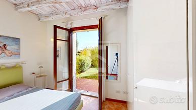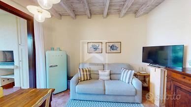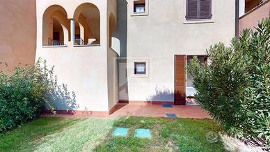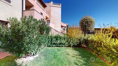 L'appartamento al piano terra viene venduto arredato con mobilio di buona qualità. La zona living luminosa con cucina open space e grande portafinestra per accedere al portico leggermente più grande della media all'interno del resort e giardino privato con vista su una delle piscine del residence.