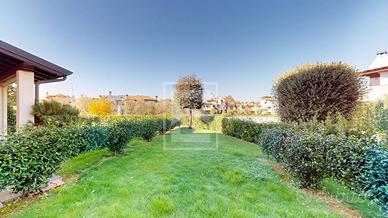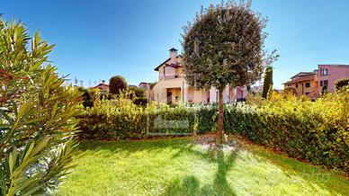 Bilocale e mezzo con portico e doppi giardini al Garda Resort Village, uno splendido residence con un enorme parco, piscine, ristorante e una vasta gamma di strutture sportive e ricreative.